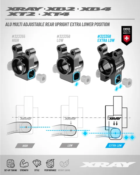 Xray a ajouté un nouvel élément optionnel en aluminium, le Support Arrière Réglable, pour son buggy XB2 1:10 2WD, qui présente une position de montage des bras de suspension extra-basse. Cette position abaissée permet une réduction supplémentaire du centre de roulis arrière, améliorant ainsi la stabilité et la vitesse en virage sur des surfaces à forte adhérence ou des pistes lisses. Usiné CNC pour une durabilité maximale, une géométrie constante et un réglage précis de la suspension. Gravé au laser avec deux flèches symboliques pour une identification facile.